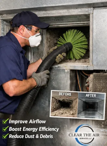 “At Clear The Air, we specialize in top-quality duct cleaning services that improve indoor air quality, reduce allergens, and enhance the efficiency of your HVAC system. Our trained professionals use advanced equipment to remove dust, debris, and contaminants from your vents, giving you peace of mind and a breath of fresh air.”